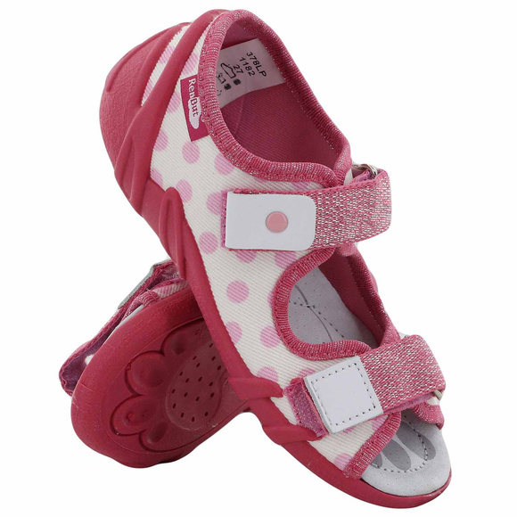 RENBUT sklep - Kapcie dziecięce obuwie tekstylne, przedszkolne, profilaktyczne wykonane z naturalnej bawełny. Wkładka wewnętrzna profilaktyczna, antybakteryjna, zawiera jony srebra, wykonana z naturalnej skóry i pianki lateksowej zawierającej aktywny węgiel drzewny absorbujący pot i zapachy. Podeszwa profilowana, oddychająca (system wentylacji) wykonana z elastycznego i lekkiego tworzywa PVC doskonale przenosi obciążenia na podłoże i amortyzuje wstrząsy. Usztywniona cholewka stabilizuje stopę. Regulowane zapięcie na rzepy pozwala precyzyjnie dopasować obuwie do różnych kształtów stopy. Obuwie pod względem konstrukcyjnym, technologicznym i materiałowym spełnia wymogi certyfikatu "Zdrowa Stopa" przyznawanego przez IPS w Krakowie i zostało wyróżnione przez specjalistów znakiem "Żółtej Stopy" jako idealne w profilaktyce kształtowania prawidłowego rozwoju, funkcjonowania i budowy stopy dziecka.
