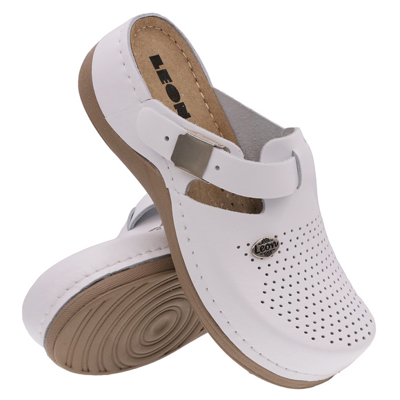 • LEON - klapki damskie medyczne, profilaktyczne, sanitarne o charakterze rekreacyjnym, produkcji włoskiej. Wierzch: tworzywo skóropodobne. Podszewka: naturalna bawełna. Wkładka wewnętrzna: naturalna skóra. Spód: lekkie tworzywo PU.