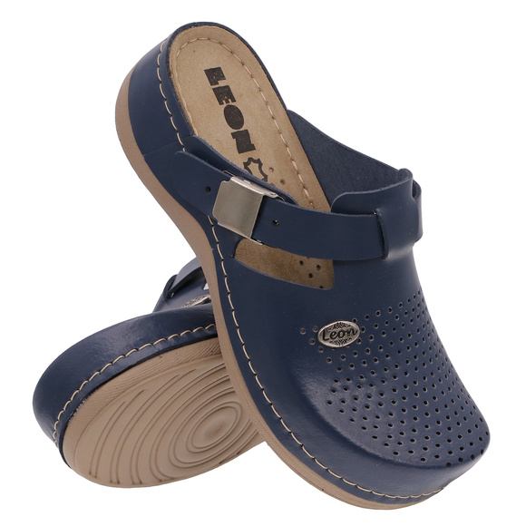 - LEON - klapki damskie medyczne, profilaktyczne, sanitarne o charakterze rekreacyjnym, produkcji włoskiej. Wierzch: tworzywo skóropodobne. Podszewka: naturalna bawełna. Wkładka wewnętrzna: naturalna skóra. Spód: lekkie tworzywo PU.