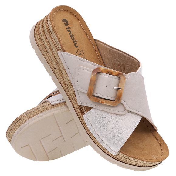 • INBLU - obuwie damskie, klapki profilaktyczne o charakterze rekreacyjnym, produkcji polskiej. Wierzch z tworzywa skóropodobnego. Wkładka wewnętrzna z naturalnej skóry. Spód z lekkiego, sprężystego tworzywa PU.