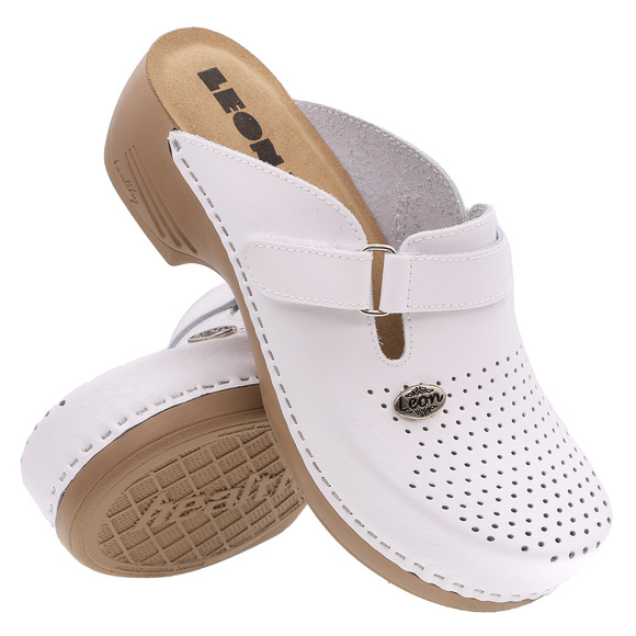 • LEON - klapki damskie medyczne, profilaktyczne, sanitarne o charakterze rekreacyjnym. Wierzch: skóra naturalna. Wkładka wewnętrzna: naturalna skóra. Spód: lekkie tworzywo PU.
