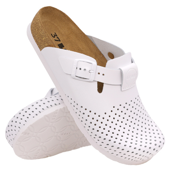 • LEON - klapki damskie medyczne, profilaktyczne, sanitarne o charakterze rekreacyjnym. Wierzch: skóra naturalna. Wkładka wewnętrzna: naturalna skóra. Spód: lekkie tworzywo PU.