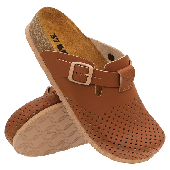 • LEON - klapki damskie medyczne, profilaktyczne, sanitarne o charakterze rekreacyjnym. Wierzch: skóra naturalna. Wkładka wewnętrzna: naturalna skóra. Spód: lekkie tworzywo PU.