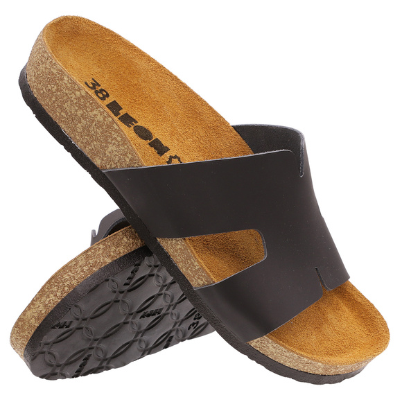 • LEON - klapki damskie medyczne, profilaktyczne, sanitarne o charakterze rekreacyjnym. Wierzch: skóra naturalna. Wkładka wewnętrzna: naturalna skóra. Spód: lekkie tworzywo PU.