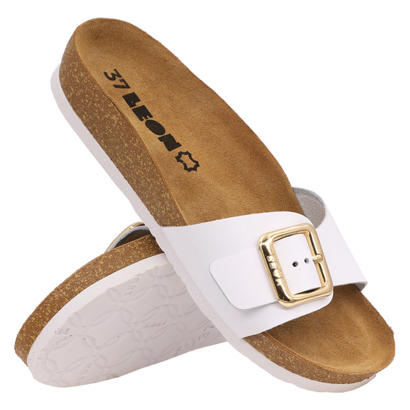 - LEON - klapki damskie casual, profilaktyczne o charakterze rekreacyjnym. Wierzch: skóra naturalna. Wkładka wewnętrzna: naturalna skóra. Spód: lekkie tworzywo PU.
