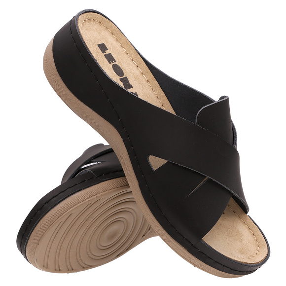Damskie, skórzane, antypoślizgowe klapki Leon 932 z anatomicznie wyprofilowaną żelową wkładką, której górna część pokryta jest miękką skórą. Żelowa wkładka amortyzuje wstrząsy podczas chodzenia i pomaga w prawidłowym rozłożeniu ciężaru na stopie. Cholewka w całości wykonana jest z wysokiej jakości naturalnej skóry bydlęcej. Buty o nowoczesnym designie sprawdzą się zarówno w czasie wolnym, jak i w pracy. Są lekkie i bardzo wygodne. Za świetną cenę otrzymasz niezwykle wygodne i wysokiej jakości buty, które chronią kręgosłup przy każdym kroku.