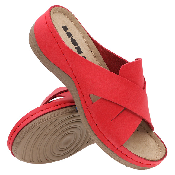 - LEON - klapki damskie casual, profilaktyczne, o charakterze rekreacyjnym. Wierzch: skóra naturalna. Wkładka wewnętrzna: naturalna skóra. Spód: lekkie tworzywo PU.