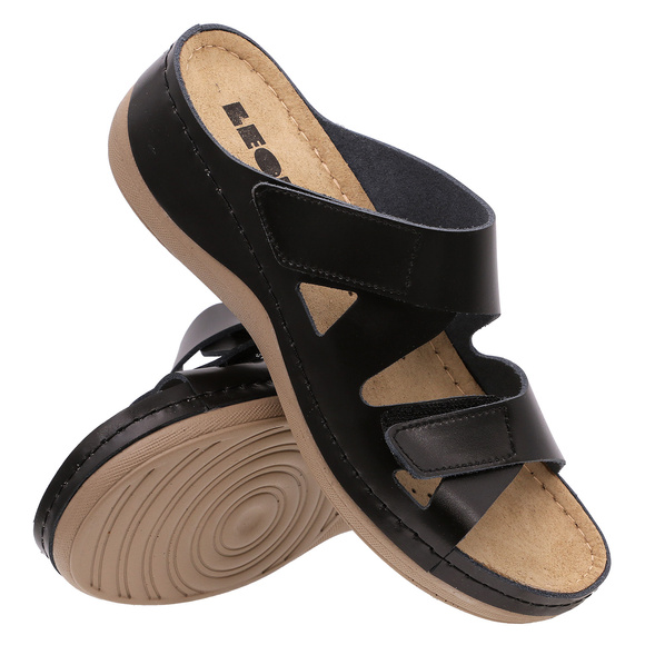 • LEON - klapki damskie casual, profilaktyczne, o charakterze rekreacyjnym. Wierzch: skóra naturalna. Wkładka wewnętrzna: naturalna skóra. Spód: lekkie tworzywo PU.