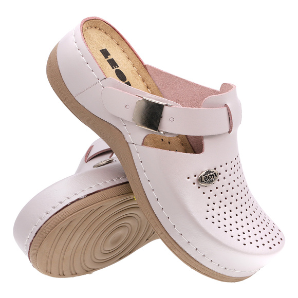 • LEON - klapki damskie medyczne, profilaktyczne, sanitarne o charakterze rekreacyjnym, produkcji włoskiej. Wierzch: tworzywo skóropodobne. Podszewka: naturalna bawełna. Wkładka wewnętrzna: naturalna skóra. Spód: lekkie tworzywo PU.